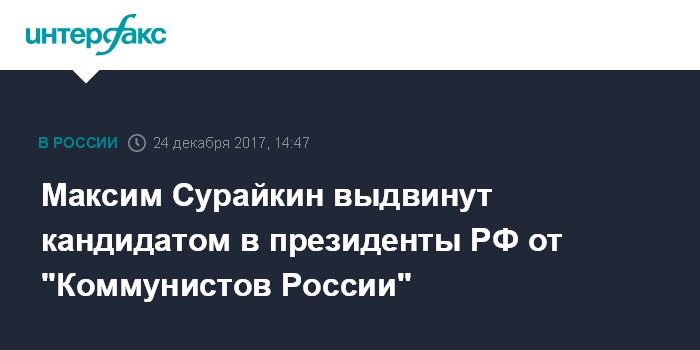 Москва. 24 декабря. INTERFAX.RU - Съезд "Коммунистов России" выдвинул своего председателя Максима Сурайкина в президенты РФ на предстоящих в марте выборах, сообщили в пресс-службе партии.