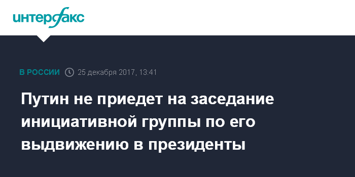 Москва. 25 декабря. INTERFAX.RU - Президент России Владимир Путин не будет участвовать в заседании инициативной группы по выдвижению его кандидатуры на новый срок, заявил пресс-секретарь главы государства Дмитрий Песков.