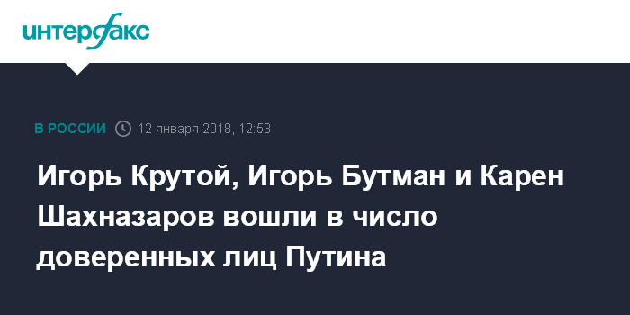 Согласно списку, приложенному к постановлению комиссии, в список доверенных лиц Путина вошли глава исполкома ОНФ Алексей Анисимов и руководитель "Волонтеров Победы" Ольга Амельченкова, композитор Игорь Крутой, глава "Мосфильма" Карен Шахназаров, певица Полина Гагарина, музыкант Игорь Бутман и другие.