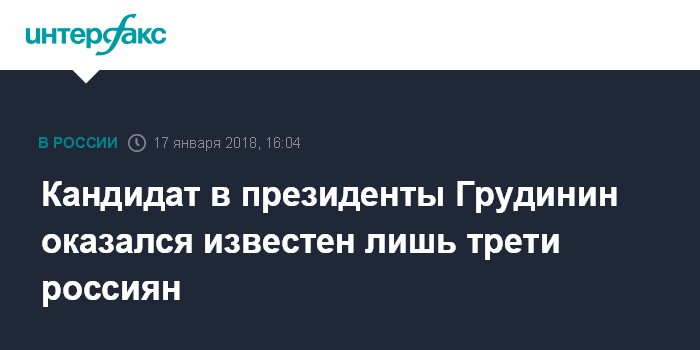 Москва. 17 января. INTERFAX.RU - О кандидате в президенты РФ Павле Грудинине знают лишь 31% россиян, большинство же (69%) впервые услышали о нем в ходе опроса, проведенного фондом "Общественное мнение".