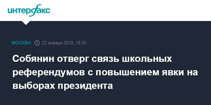 Москва. 22 января. INTERFAX.RU - Мэр Москвы Сергей Собянин усомнился в том, что школьные референдумы в столице в день выборов президента РФ проводятся для того, чтобы повысить явку.