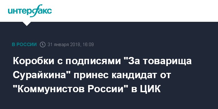 Как передает корреспондент "Интерфакса", представители штаба Сурайкина принесли в Центризбирком девять больших красных коробок с надписью "За товарища Сурайкина".