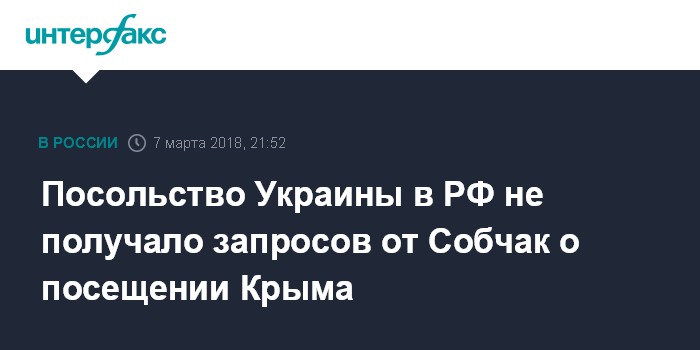 Москва. 7 марта. INTERFAX.RU - Посольство Украины в России не получало запрос от кандидата в президенты РФ от партии "Гражданская инициатива" Ксении Собчак относительно возможности посетить Крым со стороны материковой Украины.