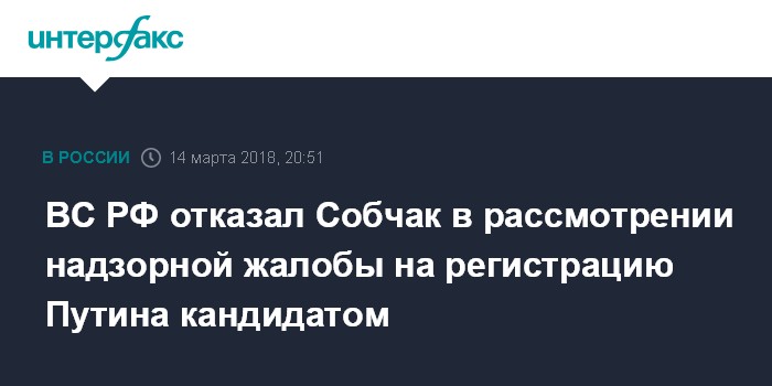 Москва. 14 марта. INTERFAX.RU - Верховный суд России не стал рассматривать надзорную жалобу кандидата в президенты Ксении Собчак на решение о признании законными действий Центральной избирательной комиссии, зарегистрировавшей Владимира Путина в качестве кандидата на выборах главы государства.