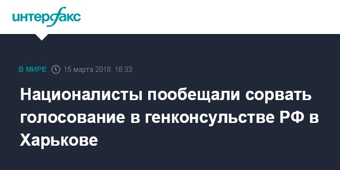 Москва. 15 марта. INTERFAX.RU - В воскресенье, день голосования на выборах президента России, активисты "ВО "Свобода", "Правого сектора" (запрещен в РФ - ИФ), Нацкорпуса и других организаций правого толка намерены провести акцию возле генконсульства Российской Федерации в Харькове.