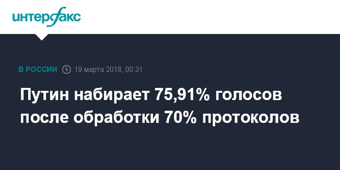 Москва. 19 марта. INTERFAX.RU - Кандидат в президенты РФ Владимир Путин продолжает уверено лидировать по итогам выборов, набирая 75,91% голосов после обработки 70% протоколов, свидетельствуют данные ЦИК.