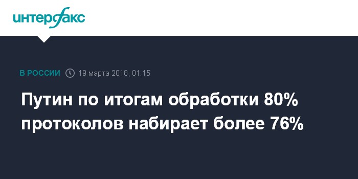 Путин по итогам обработки 80% протоколов набирает более 76%