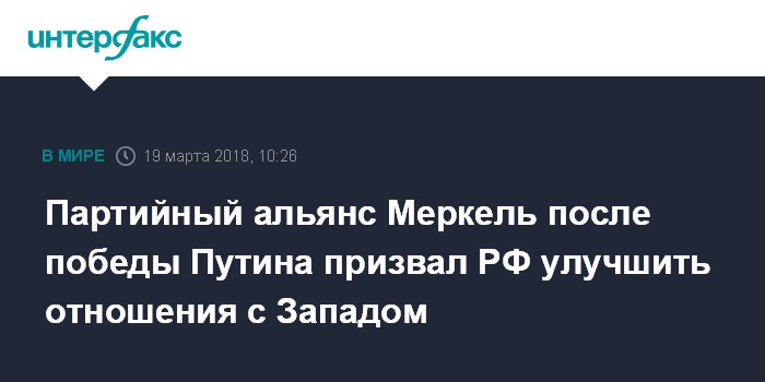 Москва. 19 марта. INTERFAX.RU - Альянс Христианско-демократического союза (ХДС) и Христианско-социального союза (ХСС), возглавляемый вновь избранным канцлером ФРГ Ангелой Меркель, после переизбрания Владимира Путина на пост президента РФ призвал Россию способствовать улучшению отношений со странами Запада.