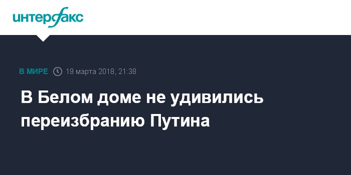 Москва. 19 марта. INTERFAX.RU - Официальный представитель Белого дома Хоган Гидли заявил, что в Вашингтоне без удивления восприняли переизбрание Владимира Путина на пост президента России, сообщает в понедельник агентство Associated Press.