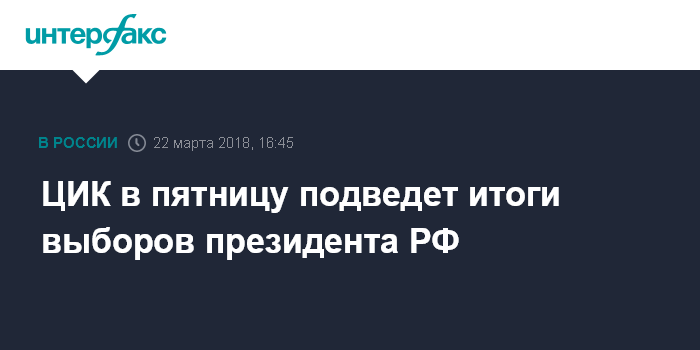 Москва. 22 марта. INTERFAX.RU - ЦИК России в пятницу подведет итоги голосования на выборах президента РФ, сообщила глава ЦИК России Элла Памфилова на заседании комиссии в четверг.