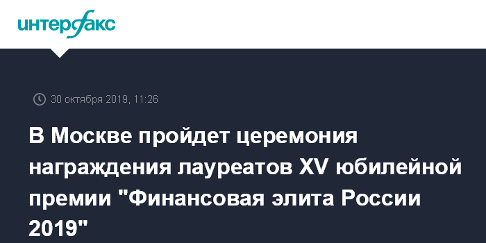 В Москве пройдет церемония награждения лауреатов XV юбилейной премии "Финансовая элита России 2019"