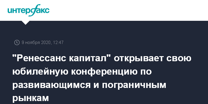 ИК "Ренессанс Капитал", ведущая инвестиционная компания на развивающихся и пограничных рынках, сегодня открывает свою Юбилейную конференцию по развивающимся и пограничным рынкам, которая пройдет 9-13 ноября 2020 года в онлайн-формате.