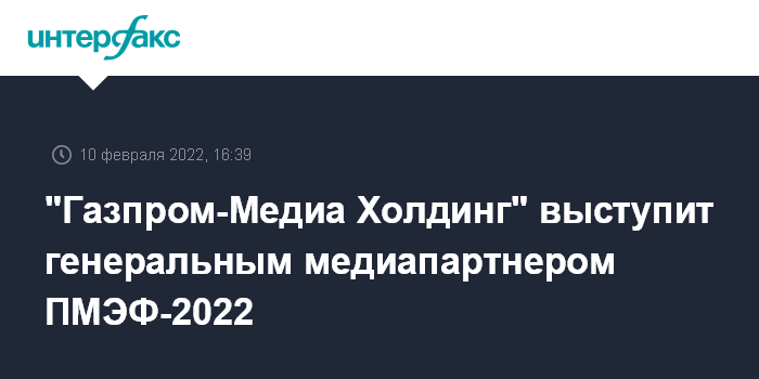 "Газпром-Медиа Холдинг", ведущий медиахолдинг в России и Восточной Европе и Фонд Росконгресс подписали соглашение о сотрудничестве в рамках Петербургского международного экономического форума (ПМЭФ-2022). "Газпром-Медиа Холдинг" выступит генеральным медиапартнером ПМЭФ-2022, который пройдет 15–18 июня 2022 года. Подписание соглашения о сотрудничестве состоялось 10 февраля 2022 года при участии генерального директора АО "Газпром-Медиа Холдинг" Александра Жарова и директора Фонда Росконгресс Александра Стуглева.
