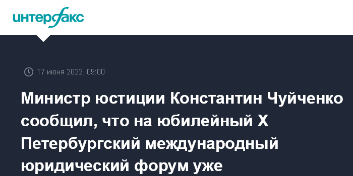 Министр юстиции Константин Чуйченко сообщил, что на юбилейный Х Петербургский международный юридический форум уже аккредитовались участники более чем из 20 стран