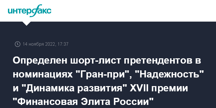 Официальное подведение итогов, награждение лауреатов и объявление полученных ими наград XVII премии "Финансовая элита России" состоится 17 ноября 2022 года в Москве.