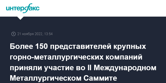 9 ноября 2022 года в Москве состоялся II Международный Металлургический Саммит "Цифровизация", в котором приняли участие более 150 представителей крупных горно-металлургических компаний России, Республики Казахстан, Республики Беларусь и др. Мероприятие официально поддержали: Департамент инвестиционной и промышленной политики города Москвы, Международная академия связи.