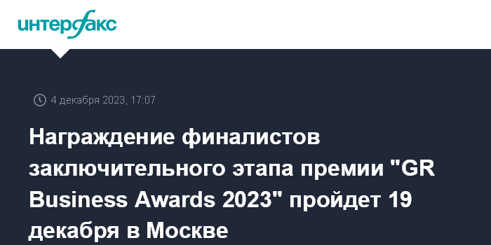 Награждение финалистов заключительного этапа премии "GR Business Awards 2023" пройдет 19 декабря в Москве
