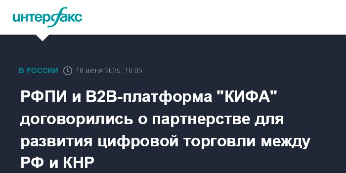 Москва. 18 июня. INTERFAX.RU - Российский фонд прямых инвестиций (РФПИ) и B2B-платформа "КИФА", действующая на территории ЕАЭС и КНР, договорились о партнерстве для развития цифровой торговли между РФ и Китаем и расширения товарооборота между двумя странами.