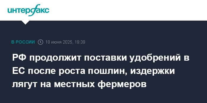 Москва. 18 июня. INTERFAX.RU - Российские производители удобрений продолжат поставки в Евросоюз после повышения импортных пошлин, рост издержек ляжет на местных аграриев. Такое мнение высказал "Интерфаксу" глава Российской ассоциации производителей удобрений (РАПУ) Андрей Гурьев в кулуарах ПМЭФ-2025.