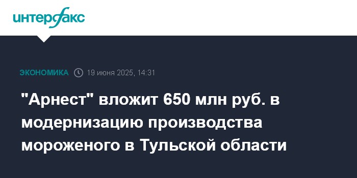 Соглашение в рамках ПМЭФ-2025 подписали губернатор Дмитрий Миляев и президент группы "Арнест" и председатель совета директоров "Арнест ЮниРусь" Алексей Сагал. "Документ предполагает комплексное развитие предприятия на территории Тульской области. Компания планирует проинвестировать в модернизацию фабрики по производству мороженого более чем 650 млн рублей и создать еще порядка 30 рабочих мест", - говорится в сообщении.
