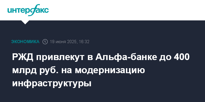 Москва. 19 июня. INTERFAX.RU - ОАО "РЖД" привлечет в АО "Альфа-банк" кредитную линию с лимитом до 400 млрд руб., сообщила компания.