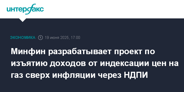 Москва. 19 июня. INTERFAX.RU - Минфин РФ прорабатывает законопроект, который позволит изъять рост доходов от повышения цен на газ сверх инфляции через НДПИ.