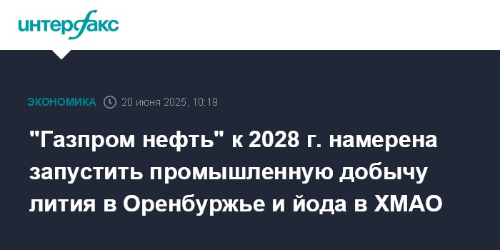 Москва. 20 июня. INTERFAX.RU - "Газпром нефть" планирует к 2028 году запустить промышленную добычу лития в Оренбургской области и йода в ХМАО, видит перспективы по другим редкоземельным компонентам на своих активах. Об этом журналистам рассказал глава компании Александр Дюков.