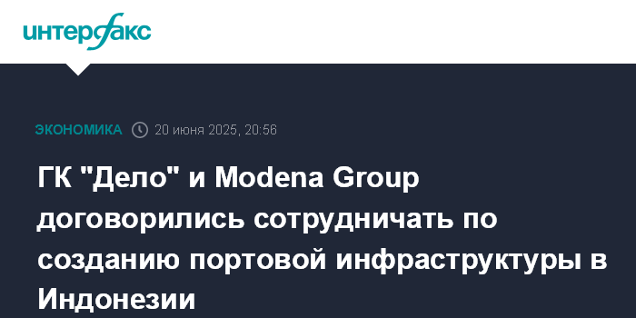 Москва. 20 июня. INTERFAX.RU - Группа компаний "Дело" и компания Mologiz (логистическое подразделение Modena Group) договорились изучить возможность реализации проекта по созданию глубоководного морского порта и сопутствующей инфраструктуры в Индонезии, сообщили в ГК "Дело".