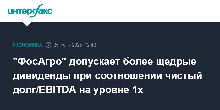 Москва. 25 июня. INTERFAX.RU - "ФосАгро" может вернуться к более щедрым дивидендам после снижения соотношения чистый долг/EBITDA до уровня 1х, до этого будет отдавать приоритет погашению долга, рассказал журналистам генеральный директор компании Михаил Рыбников в кулуарах ПМЭФ-2025.