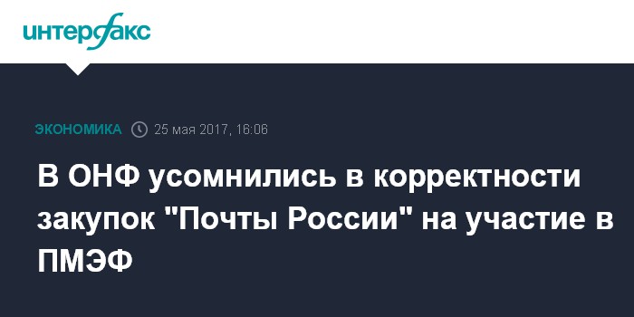 Москва. 25 мая. INTERFAX.RU - Активисты Общероссийского народного фронта (ОНФ) выявили сомнительную закупочную процедуру "Почты России" на участие в Петербургском международном экономическом форуме, сообщает пресс-служба движения.