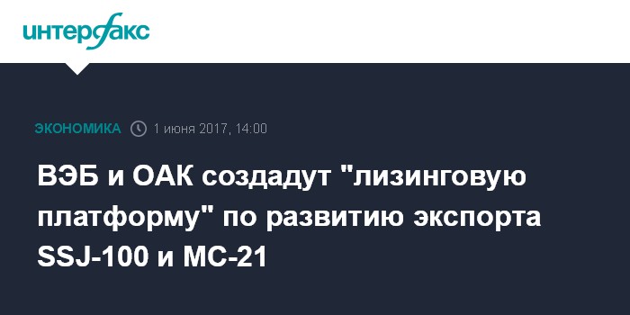 Москва. 1 июня. INTERFAX.RU - "Объединенная авиастроительная корпорация" (ОАК) и ВЭБ в рамках ПМЭФ-2017 подписали соглашение о сотрудничестве. Как говорится в совместном сообщении сторон, компании договорились развивать лизинговую платформу для продвижения самолетов SSJ-100 и МС-21 за рубежом.