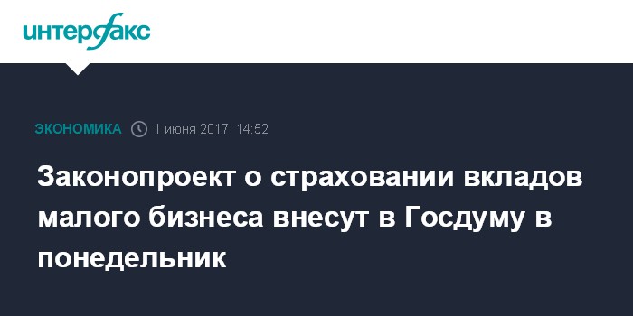 Москва. 1 июня. INTERFAX.RU - Законопроект о расширении страхования на вклады малого бизнеса во всех банках будет внесён в Госдуму в понедельник, сказал "Интерфаксу" глава комитета Госдумы по финансовому рынку Анатолий Аксаков в кулуарах ПМЭФ-2017. Предполагается, что вклады микро- и малого бизнеса будут страховаться в пределах 1,4 млн рублей.