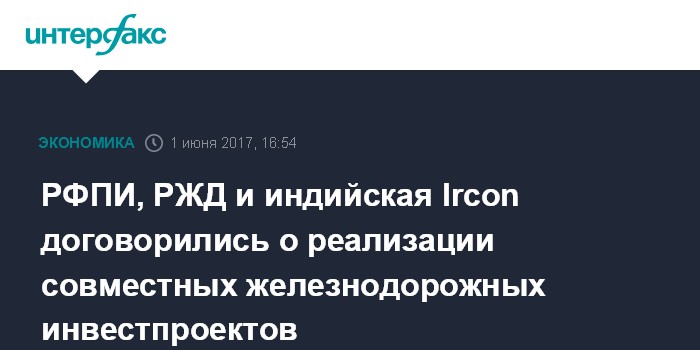 Москва. 1 июня. INTERFAX.RU - Российский фонд прямых инвестиций (РФПИ), ООО "РЖД Интернешнл" (дочка ОАО "РЖД", РЖДИ) и индийская государственная инженерная и строительная компания Ircon International Limited в рамках ПМЭФ-2017 подписали соглашение о сотрудничестве в области инвестирования в проекты железнодорожной инфраструктуры в России и Индии.