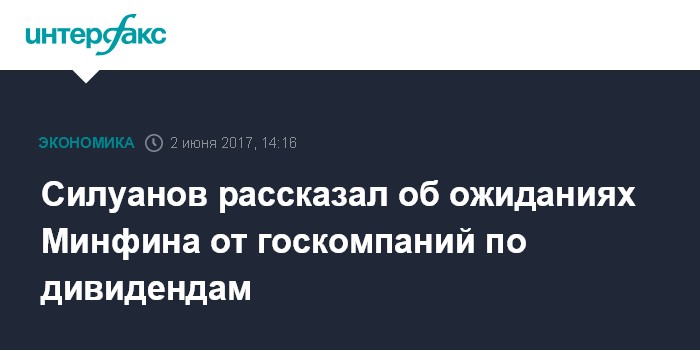 Москва. 2 июня. INTERFAX.RU - Минфин РФ в ближайшие три года ждет от госкомпаний выплаты дивидендов в размере 50% чистой прибыли, заявил министр финансов Антон Силуанов в интервью РБК ТВ.
