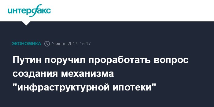 Москва. 2 июня. INTERFAX.RU - Президент Владимир Путин поручил правительству проработать вопрос создания механизма "инфраструктурной ипотеки" для реализации крупных проектов с привлечением платежей пользователей и частных инвесторов.