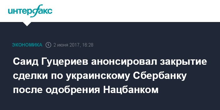 Сбербанк России 27 марта объявил о планах продажи 100% акций украинского дочернего банка консорциуму инвесторов. В него войдут латвийский Norvik Banka, который принадлежит бизнесмену Григорию Гусельникову, и белорусская частная компания, подконтрольная сыну владельца нефтяной компании "Русснефть" Михаила Гуцериева Саиду. Российский Сбербанк при этом официально заявил об уходе с украинского рынка. Сбербанк предполагал, что сделка будет закрыта в первом полугодии 2017 года.