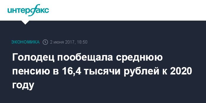 Москва. 2 июня. INTERFAX.RU - Вице-премьер Ольга Голодец заявила, что к 2020 году пенсия в России должна составить в среднем 16,4 тысячи рублей.