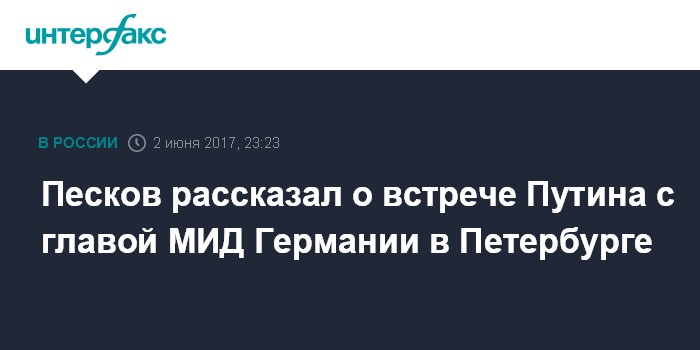 "В конце рабочего дня в Константиновском дворце Владимир Путин принял министра иностранных дел Германии Габриэля, который прибыл на Петербургский международный экономический форум. Обсудили вопросы двусторонних российско-германский отношений", - сказал Песков журналистам.