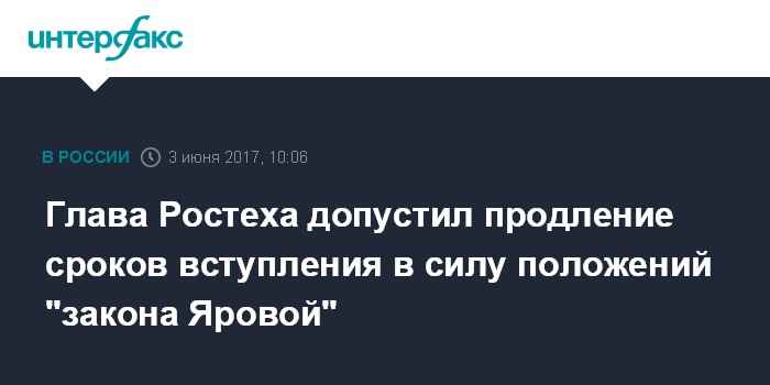 Москва. 3 июня. INTERFAX.RU - Сроки реализации положений в рамках так называемого "закона Яровой" могут быть продлены, такое мнение высказал журналистам глава ГК "Ростех" Сергей Чемезов в кулуарах ПМЭФ-2017.