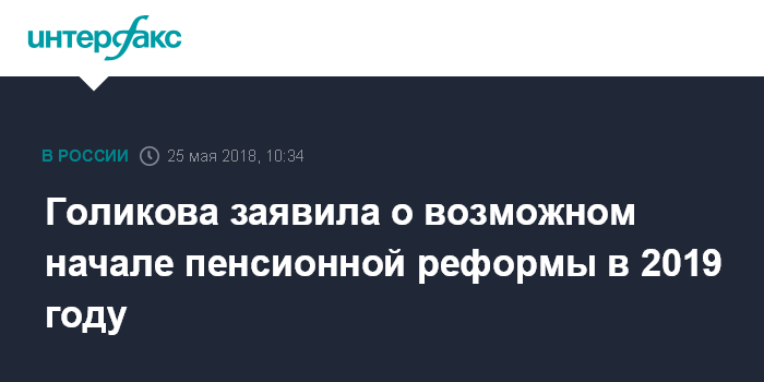 Москва. 25 мая. INTERFAX.RU - Пенсионная реформа в России, возможно, будет реализовываться в течение нескольких лет, начиная с 2019 года, заявила вице-премьер Татьяна Голикова.