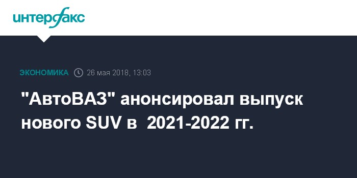 Москва. 26 мая. INTERFAX.RU - ПАО "АвтоВАЗ" в 2021-2022 годах планирует выпустить новый SUV, сообщил действующий президент компании Николя Мор (покинет пост с 1 июня 2018 года) журналистам в субботу в Петербурге.