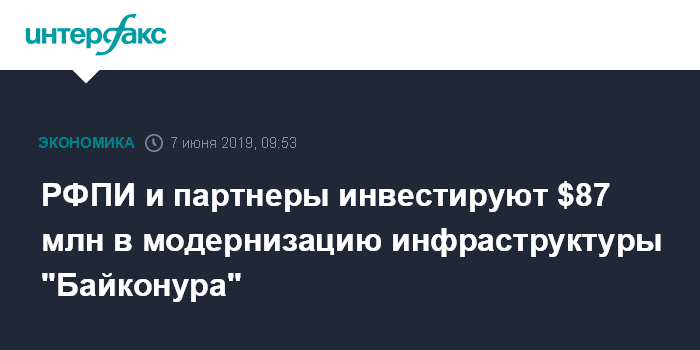 Москва. 7 июня. INTERFAX.RU - Российский фонд прямых инвестиций, ближневосточные инвесторы, АО "Главкосмос пусковые услуги" инвестируют $87 млн в проект модернизации инфраструктуры космодрома "Байконур", сообщил гендиректор РФПИ Кирилл Дмитриев в ходе встречи президента Владимира Путина с членами международного экспертного совета фонда "на полях" ПМЭФ-2019.