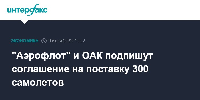 Москва. 8 июня. INTERFAX.RU - "Аэрофлот" и "Объединенная авиастроительная корпорация" (ОАК, входит в госкорпорацию "Ростех") планируют подписать рамочный договор на поставку 300 самолетов. Об этом сообщила газета "Ведомости" со ссылкой на два источника, знакомых с планами авиакомпании.