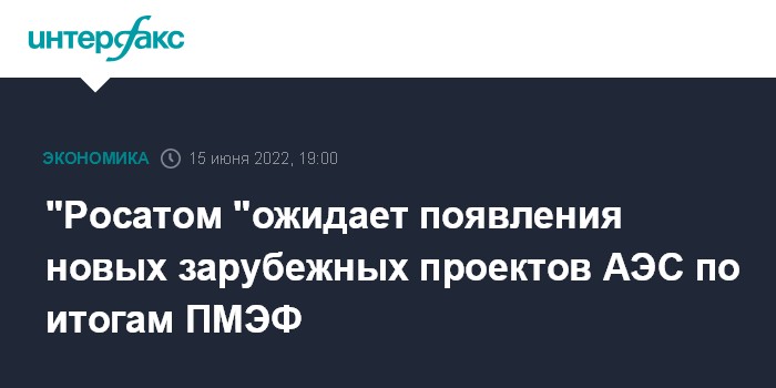 Москва. 15 июня. INTERFAX.RU - ГК "Росатом" планирует в рамках ПМЭФ-2022 переговоры, по результатам которых у компании могут появиться новые зарубежные проекты по строительству АЭС, следует из интервью телеканалу РБК гендиректора компании Алексея Лихачева.