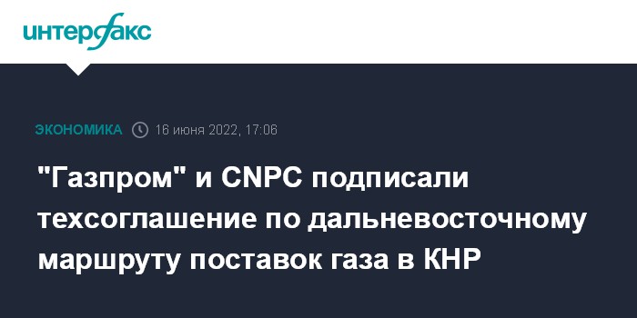 Москва. 16 июня. INTERFAX.RU - "Газпром" и CNPC подписали техническое соглашение по "дальневосточному" маршруту поставок российского газа в Китай, сообщает концерн.