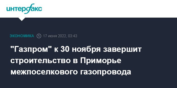 Москва. 17 июня. INTERFAX.RU - "Газпром" планирует завершить строительство в Приморском крае межпоселкового газопровода от ГРС Большой Камень до Фокино к 30 ноября, сообщила в пятницу пресс-служба краевого правительства со ссылкой на гендиректора ООО "Газпром межрегионгаз" Сергея Густова.