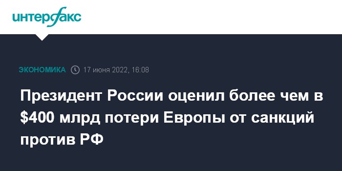 Москва. 17 июня. INTERFAX.RU - Президент РФ Владимир Путин заявил, что потери европейской экономики от введенных против России санкций могут превысить $400 млрд.