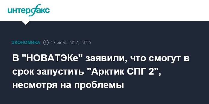 Москва. 17 июня. INTERFAX.RU - "НОВАТЭК" сможет в срок запустить "Арктик СПГ 2", несмотря на имеющиеся проблемы с этим проектом.
