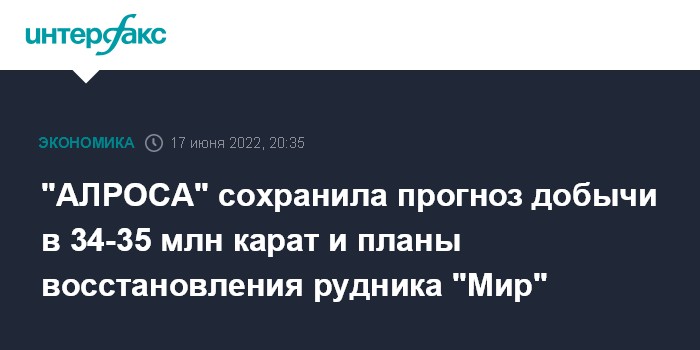 Москва. 17 июня. INTERFAX.RU - "АЛРОСА" сохраняет первоначальный прогноз по добыче на этот год в 34-35 млн карат, а также планы по восстановлению рудника "Мир", заявил журналистам в кулуарах ПМЭФ глава компании Сергей Иванов.