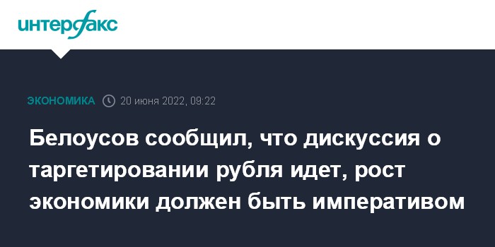 Москва. 20 июня. INTERFAX.RU - Механизм, позволяющий в условиях плавающего курса обеспечивать его достаточную стабильность, в текущих условиях почти не работает, правительству и ЦБ нужно переосмыслить экономические механизмы последних лет, поставив во главу угла рост, для которого важен и оптимальный курс рубля, заявил в интервью "Интерфаксу" первый вице-премьер РФ Андрей Белоусов на площадке Петербургского международного экономического форума; он также сообщил, что власти обсуждают возможный переход к таргетированию рубля, а не инфляции.